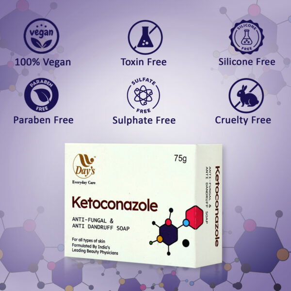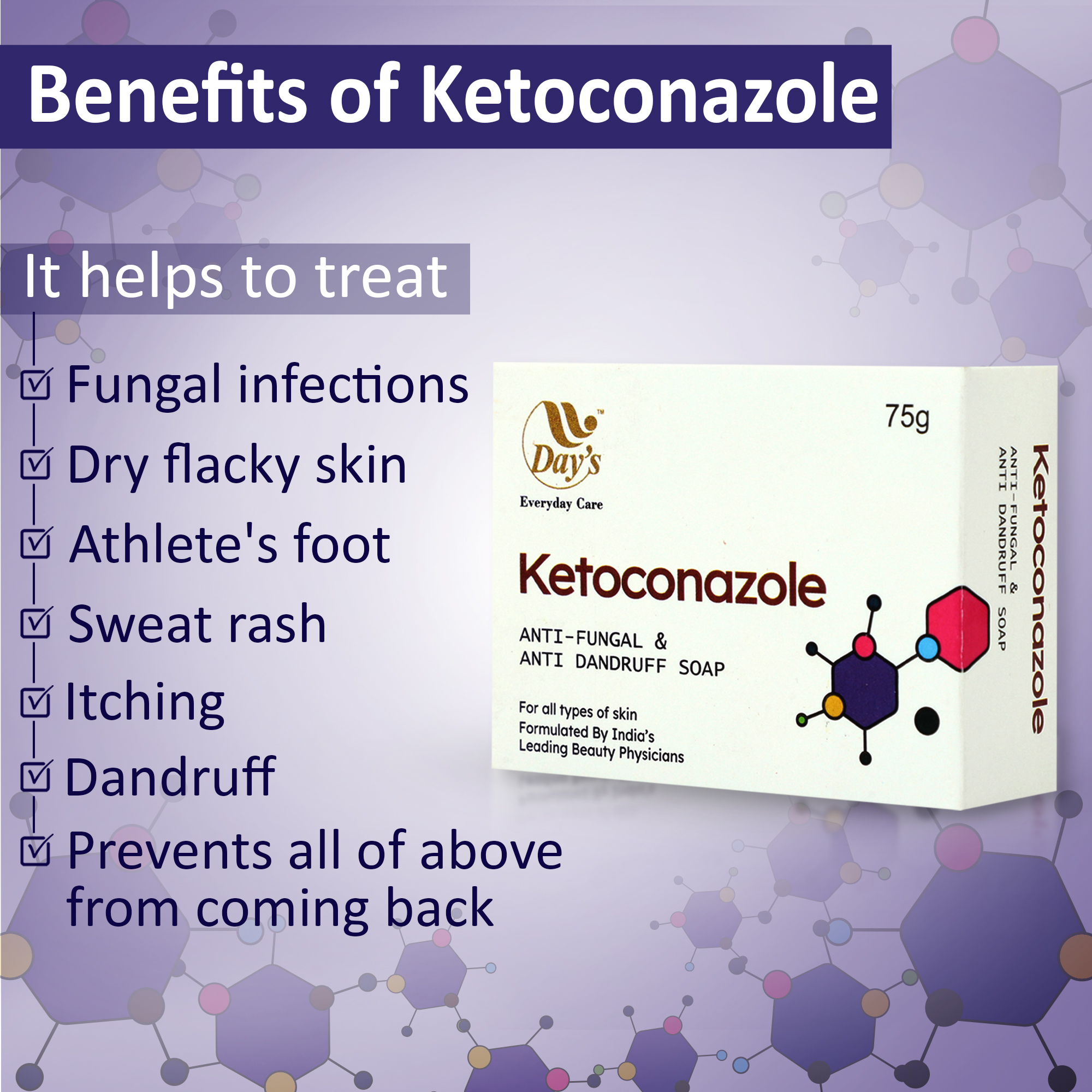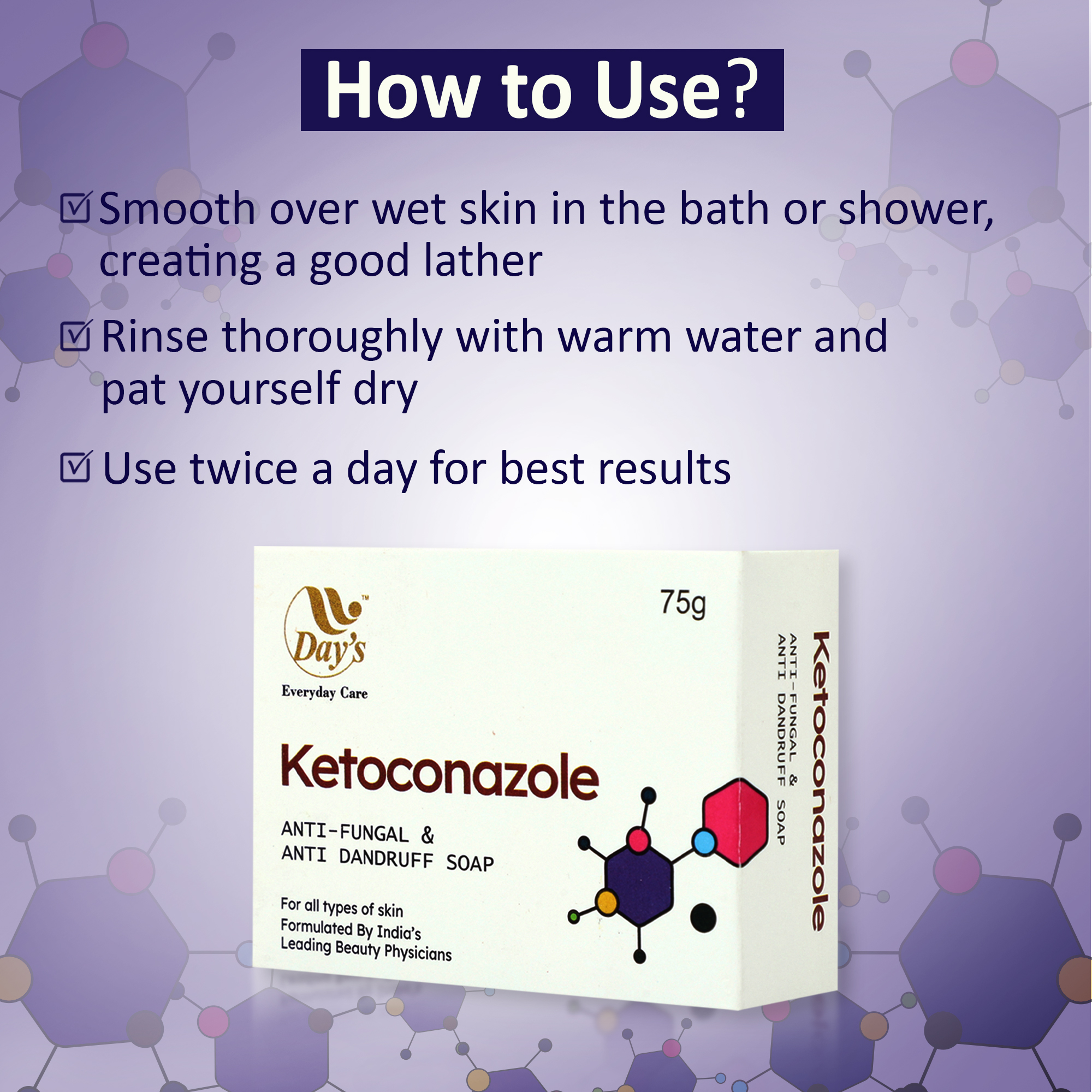 - Keto Soap, 75 gm is an antifungal that is primarily used to treat fungal infections of the skin. Ketoconazole present in this soap inhibits the synthesis of chemicals in fungi and inhibits their growth. Thus, preventing the spread of infection. It helps to keep hair and scalp clean and free from dandruff by gently unclogging the crusts that form around follicles.